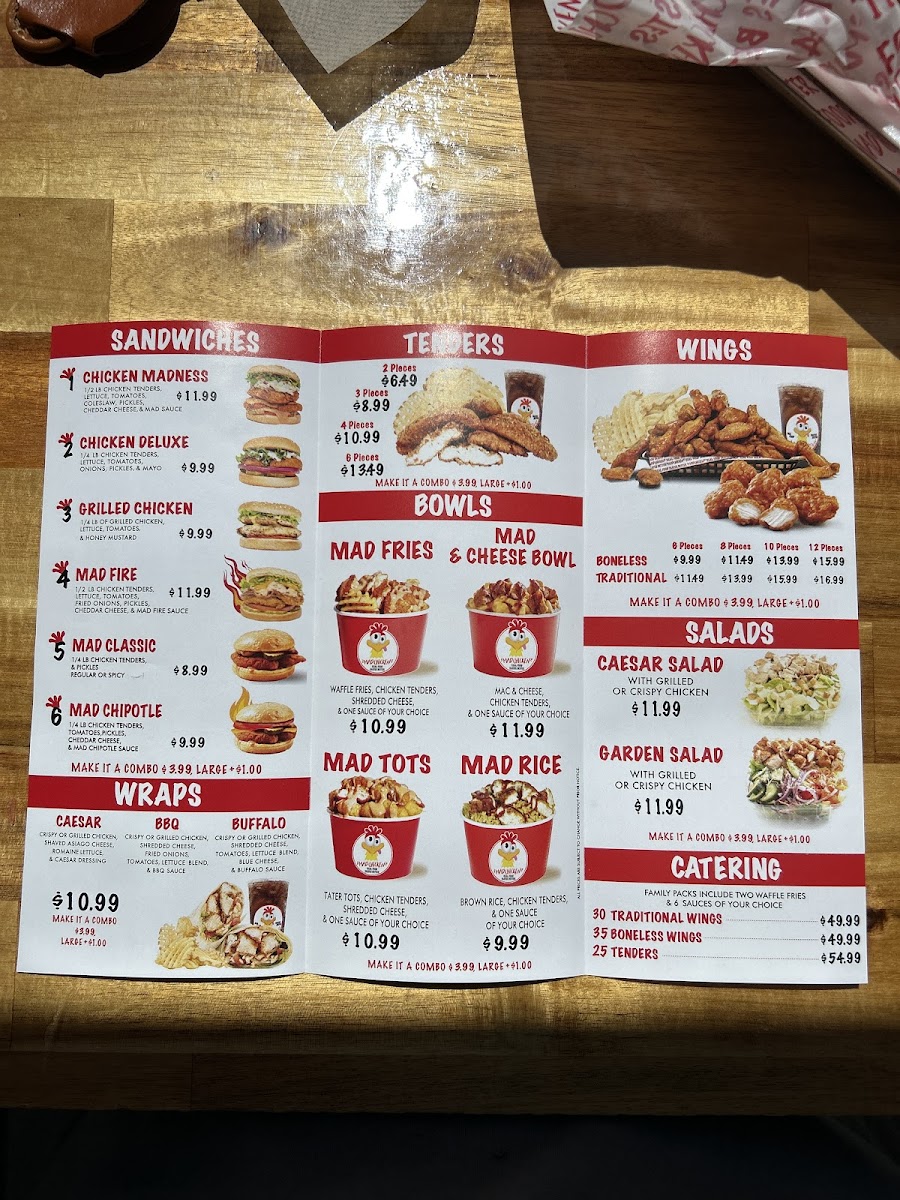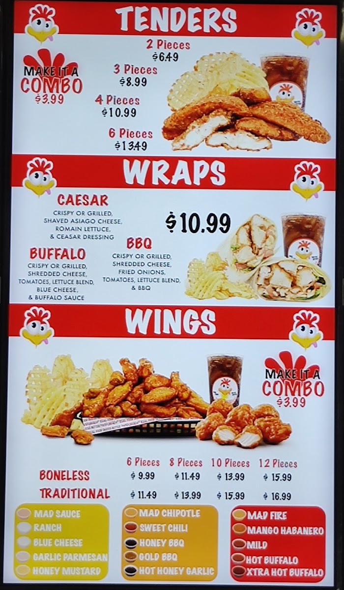 1/4 lb chicken tenders, tomatoes, pickles & your choice of mad sauce or mad fire sauce